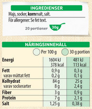 Elintarvikkeiden ravintosisältö ilmoitetaan aina 100 grammaa kohti. Kellogg’s ilmoittaa ravintosisällön myös suositeltua annosta kohti. Useimpien aamiaisruokien annos on 30 grammaa. Kellogg’s ilmoittaa myös, kuinka monta annosta pakkaus sisältää.